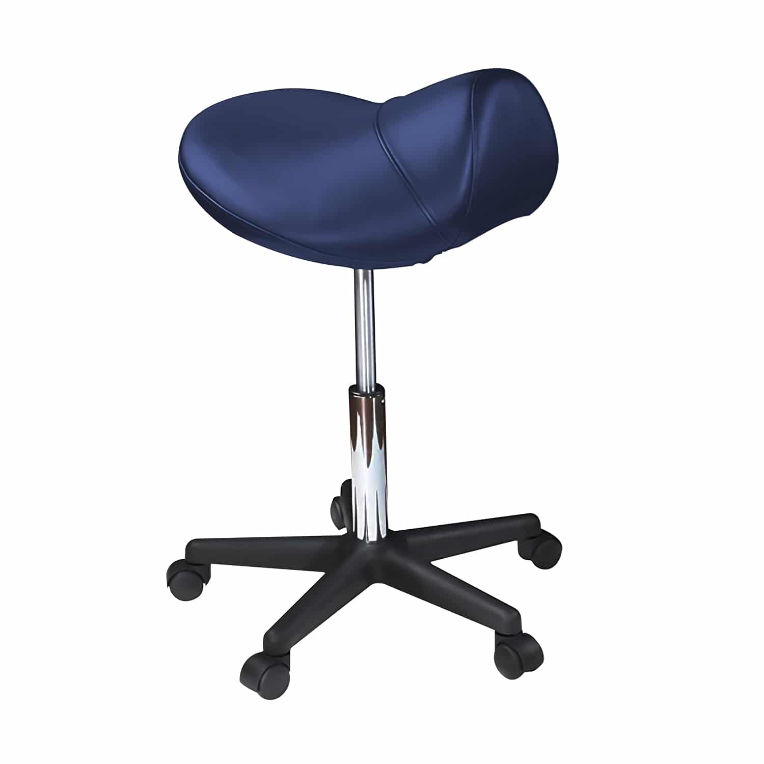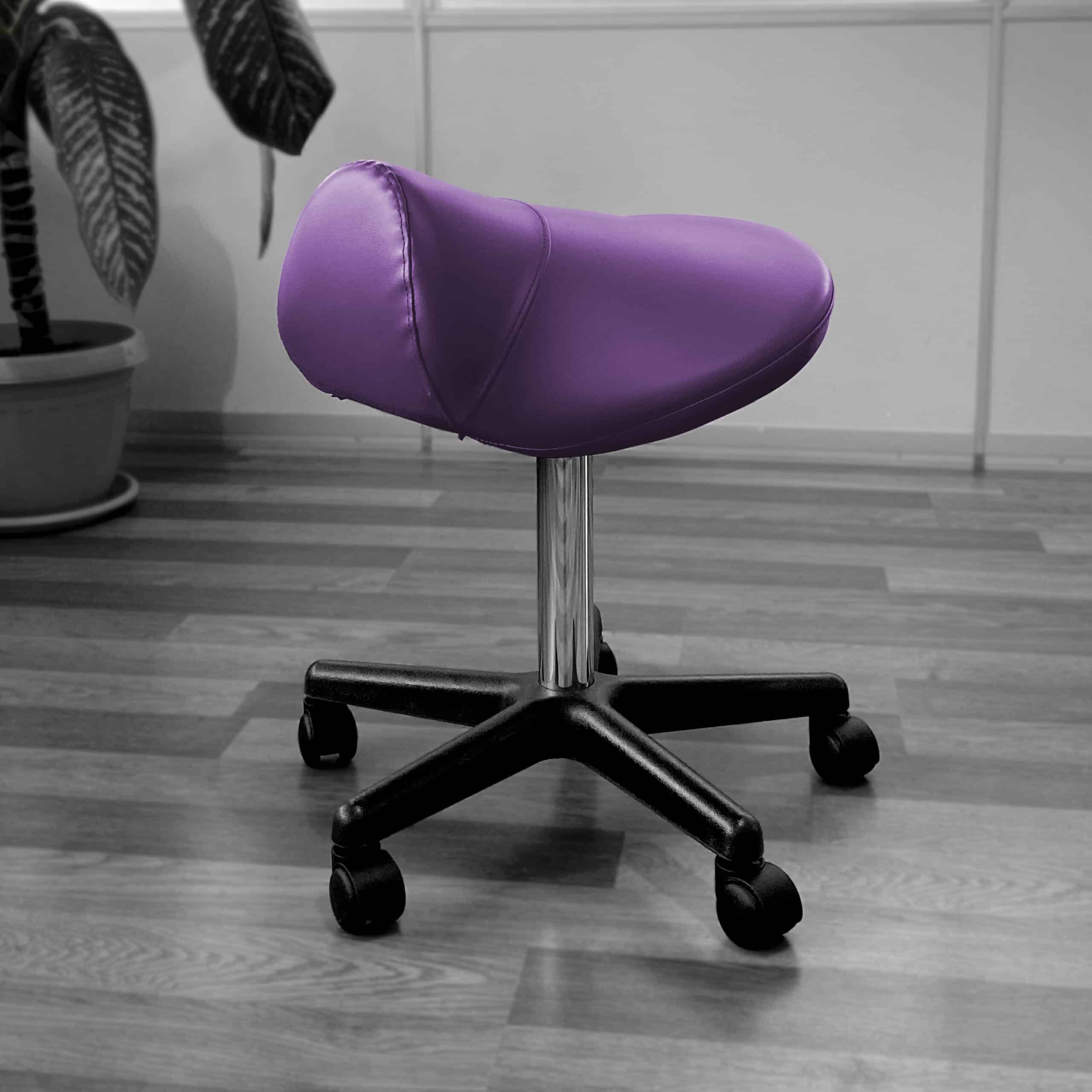 El taburete ecopostural Pony tiene una forma anatómica original que ayuda a mantener una postura adecuada con un elevador hidráulico neumático y una rotación completa de 360°.